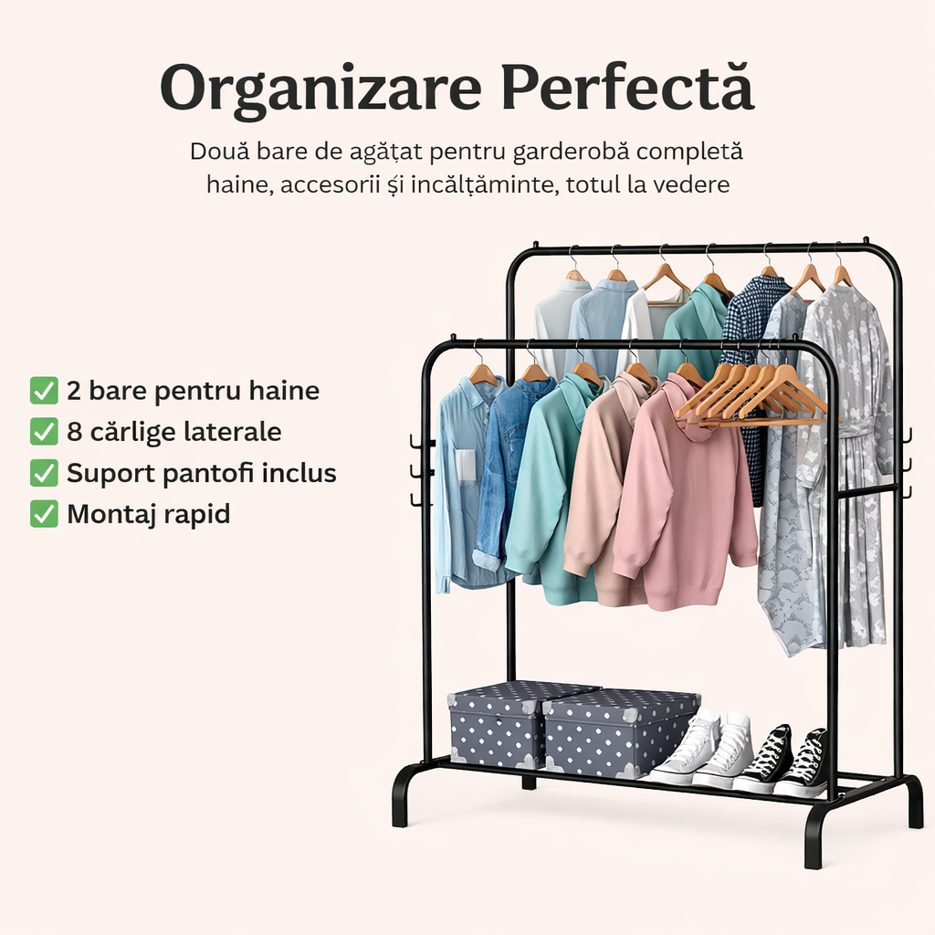 Structură metalică solidă, capete cu biluțe antiderapante care împiedică alunecarea umerașelor și 4 protecții pentru podea.